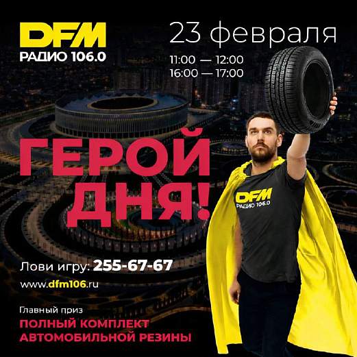 Слушай 23 февраля 2026 года эфиры PARTY TIME в 11:00 и в 16:00 на DFM и участвуй в игре «ГЕРОЙ ДНЯ»!